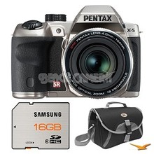 Pentax Silver X-5 16MP 26x Zoom Megazoom Digital Camera 16GB Card and Case Bundle Includes: X-5 16MP 26x Optical Zoom Megazoom Digital Camera Kit (Silver) SD High Speed 16GB Waterproof and Shock.